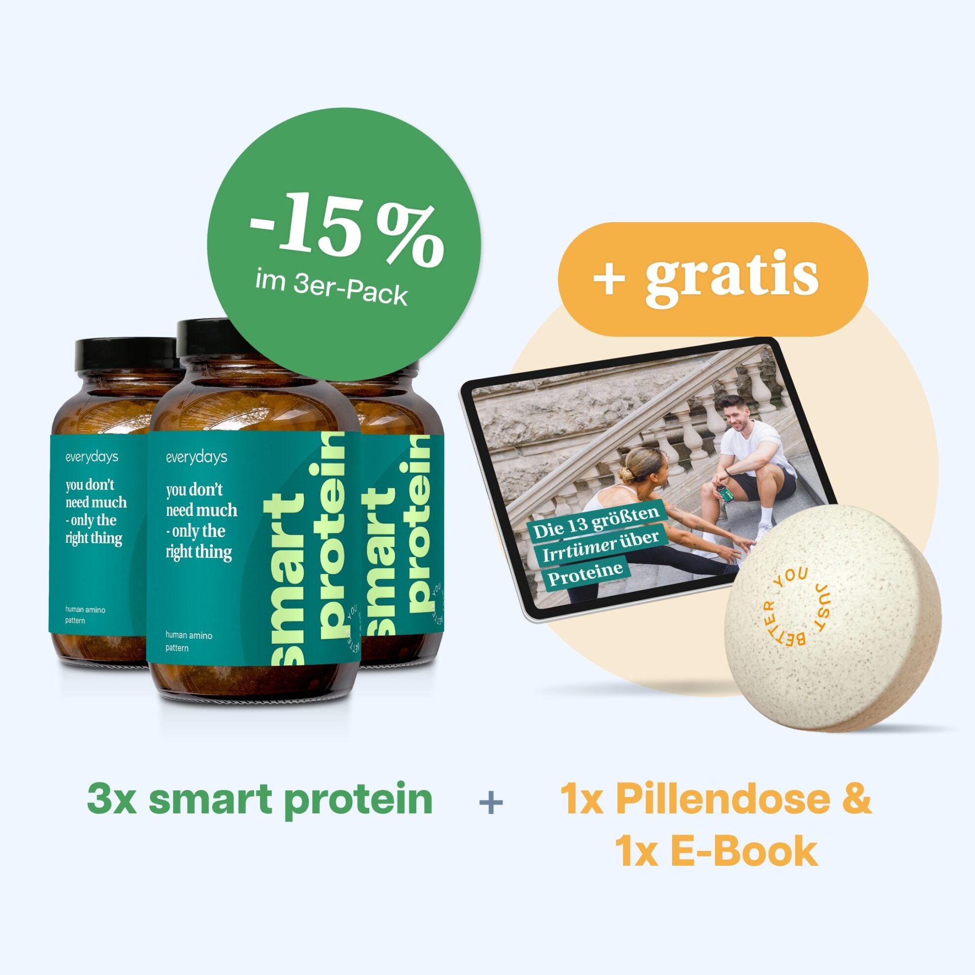 Angebotsinhalt: 3 Monats-Vorrat (3 Packungen), Premium Pillendose, E-Book über Proteinirrtümer