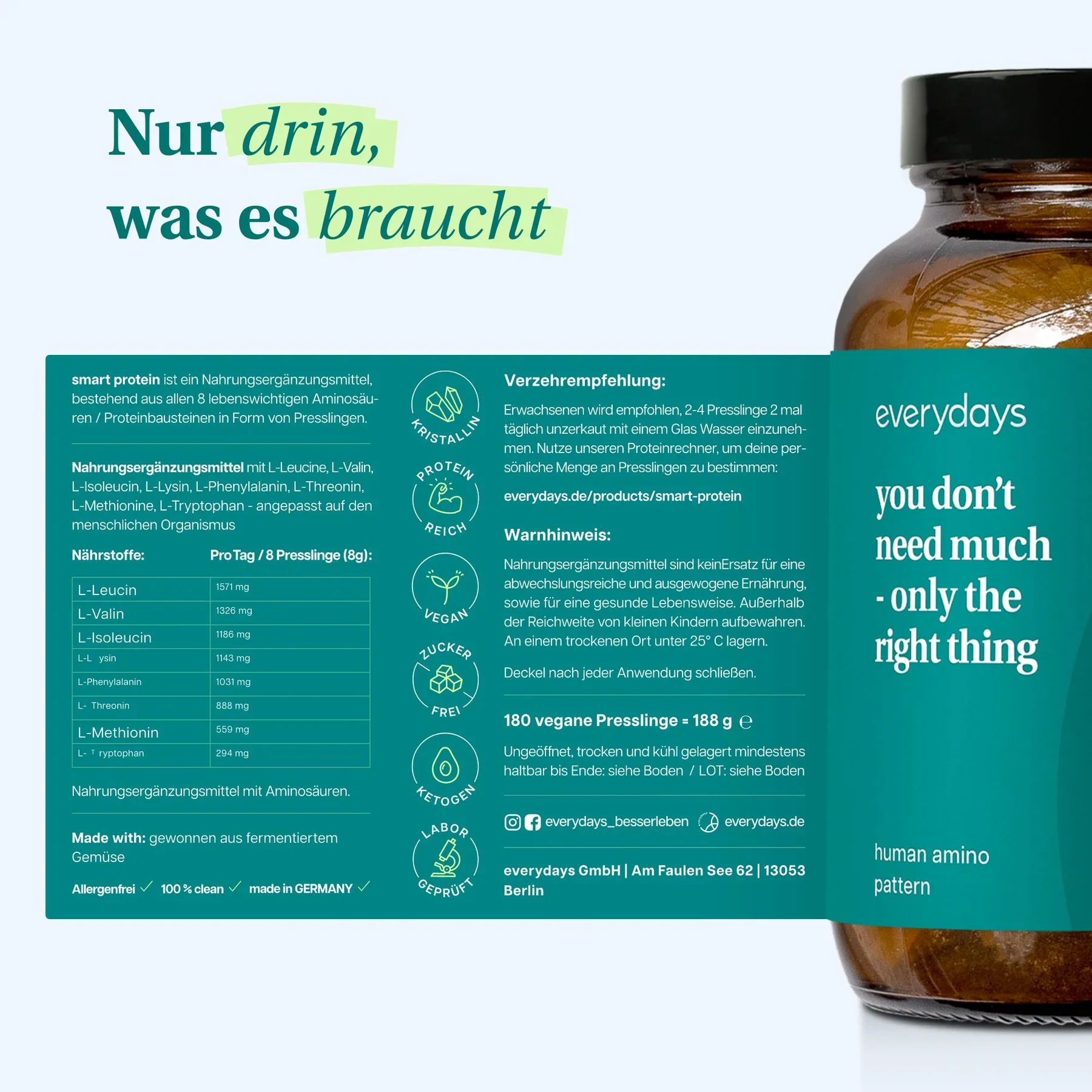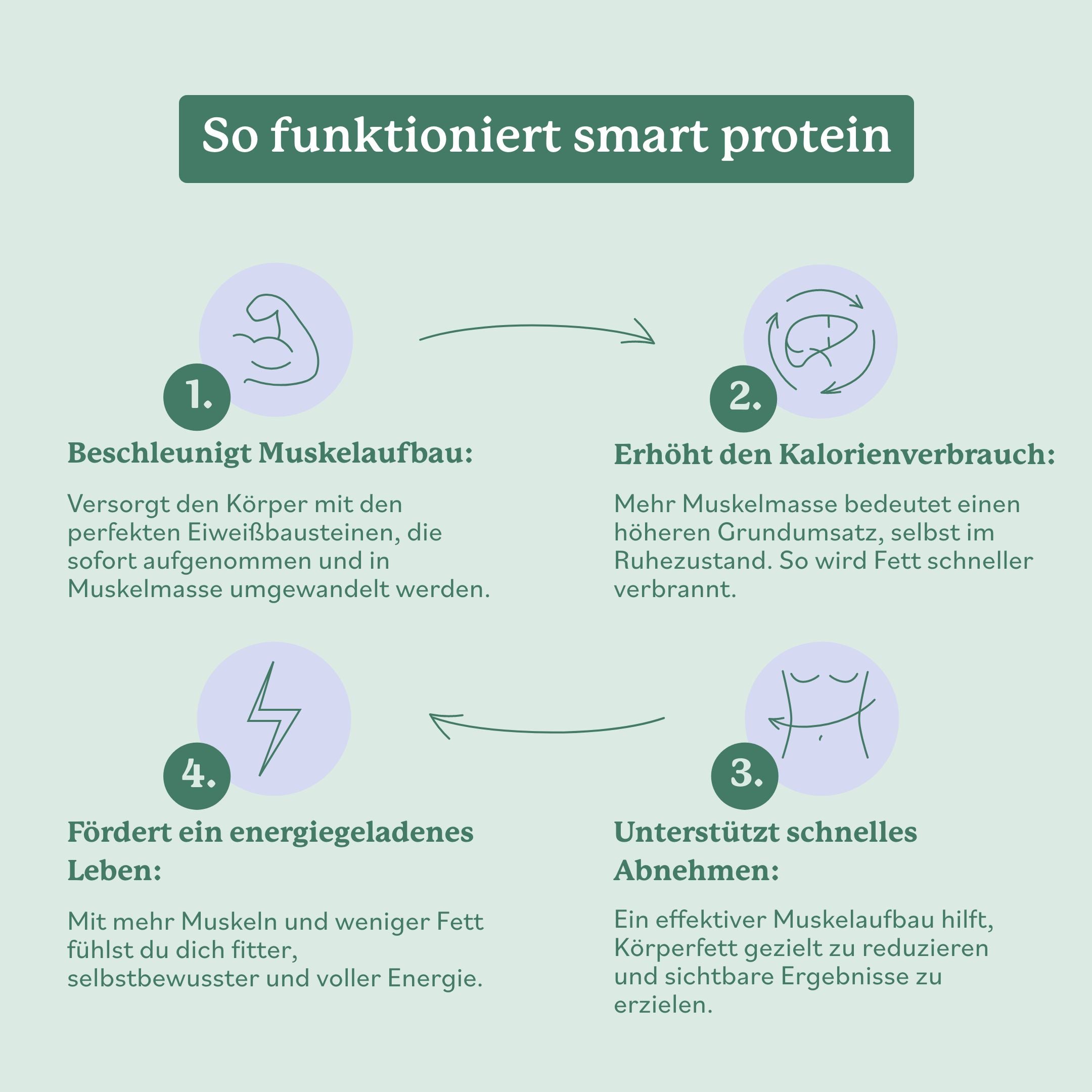 Die Aminosäuren in smart protein sind so kombiniert, dass sie optimal vom Körper verwertet werden können. Im Vergleich zu herkömmlichen Proteinquellen wie Shakes oder Lebensmitteln wird smart protein schneller aufgenommen und nahezu vollständig in Muskelmasse umgewandelt.