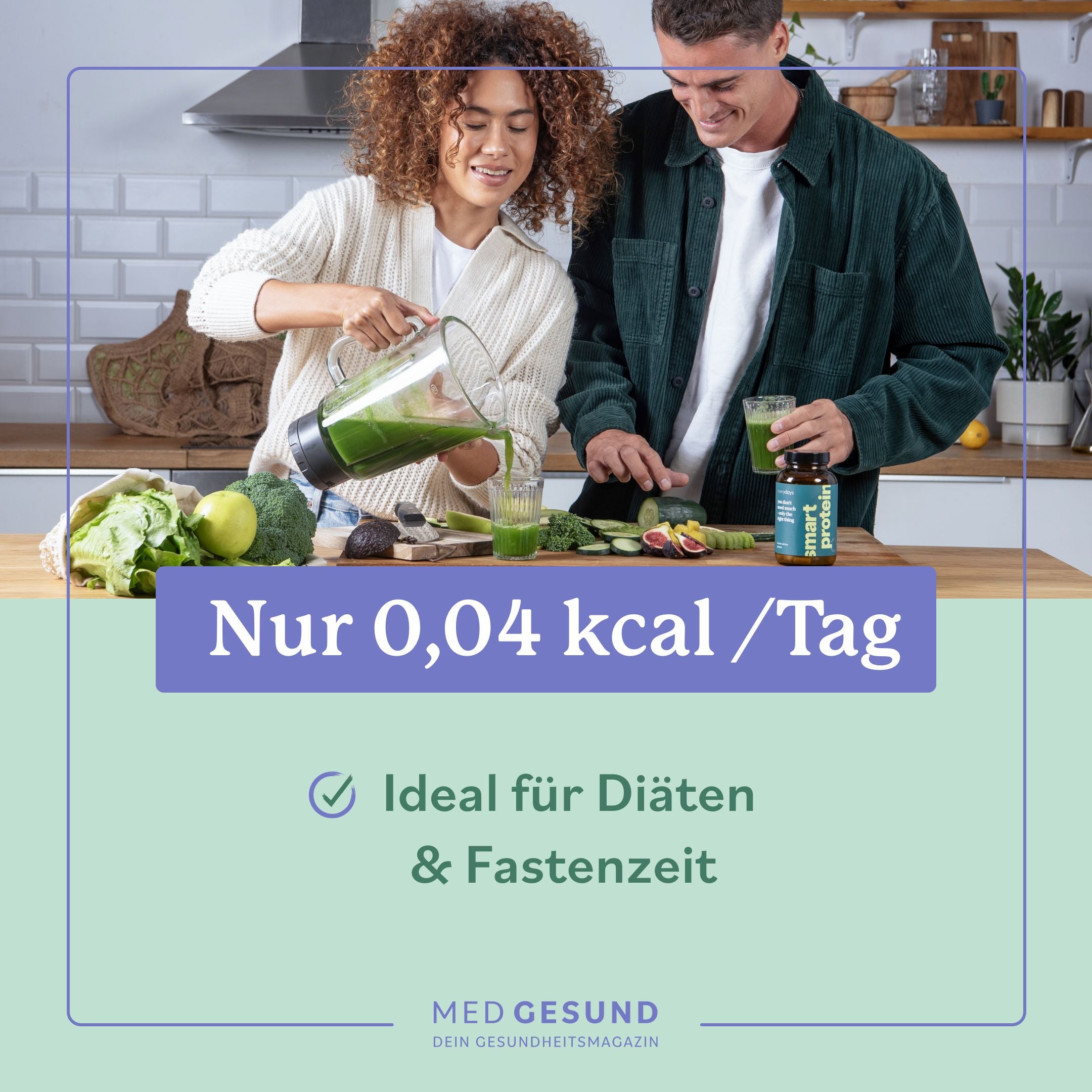 smart protein enthält fast keine Kalorien, weil die Aminosäuren direkt für den Aufbau von Muskeln, Haut, Haaren und Gewebe genutzt werden. Nur wenn Eiweiß als Energiequelle verbrannt wird, entstehen Kalorien. Je hochwertiger eine Proteinquelle ist, desto weniger wird davon zu Energie umgewandelt – und genau darin liegt der Vorteil von Smart Protein.