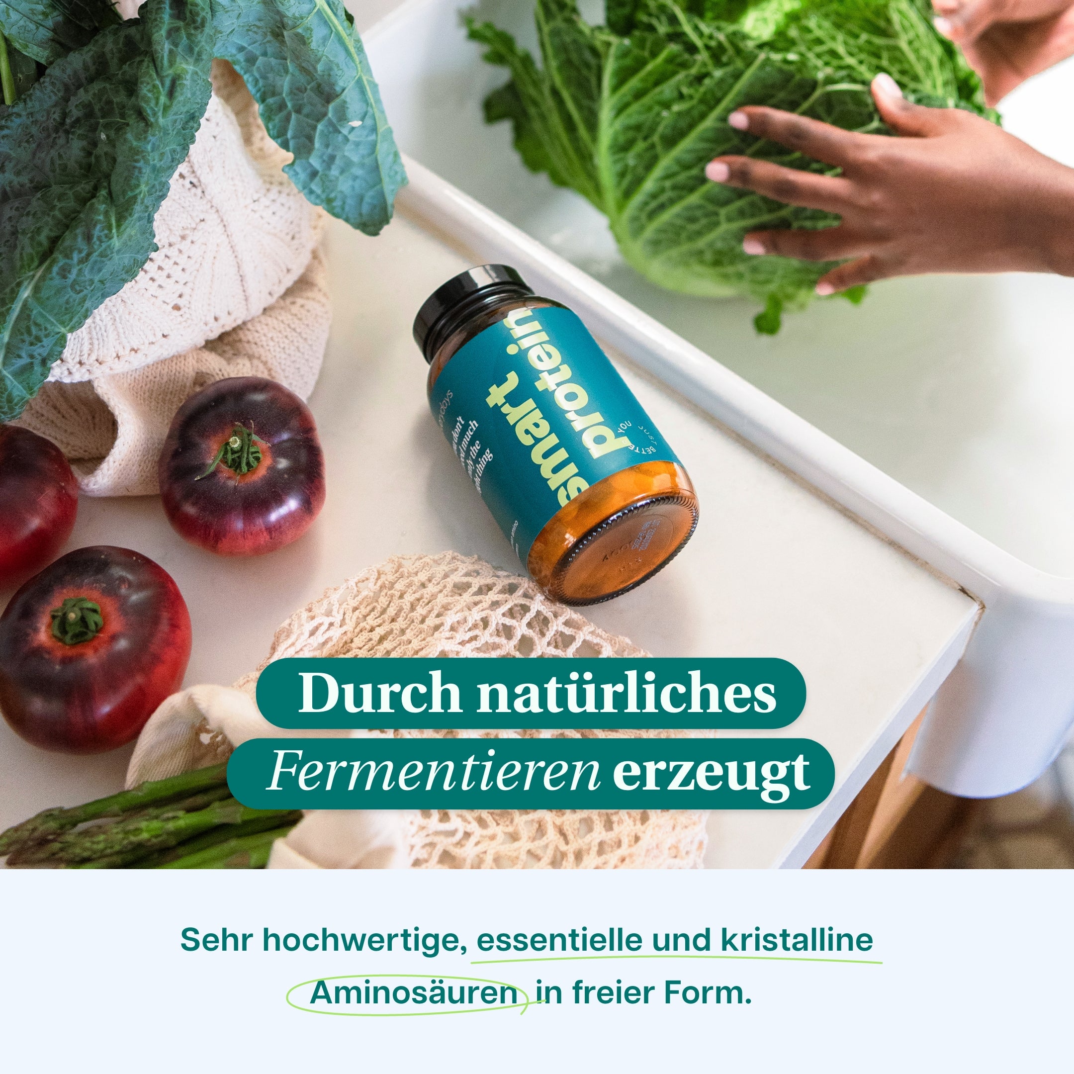 Die Aminosäuren in smart protein werden aus Gemüse herausfermentiert und gereinigt. Der Fermentationsprozess stellt ein verdauungsähnliches Verfahren dar, was die maximale Bioverfügbarkeit sicherstellt.
