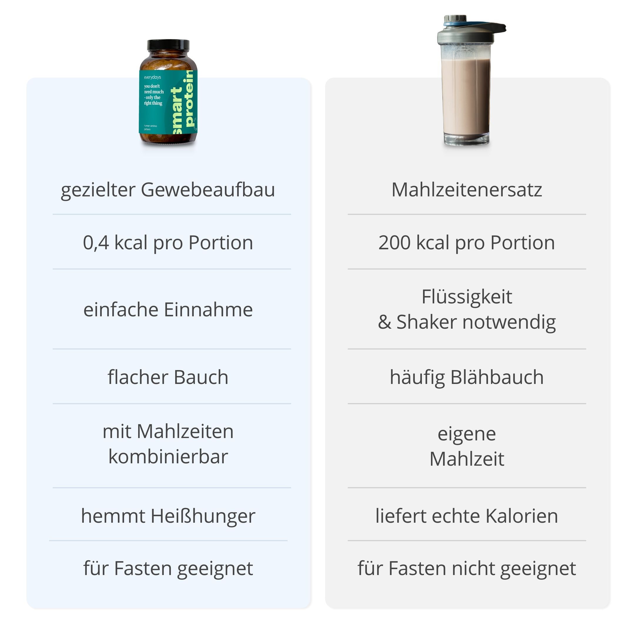 Proteinshakes sind in erster Linie als Mahlzeitenersatz gedacht. Sie füllen den Magen, liefern viele Kalorien und beanspruchen die Verdauung. Außerdem können tierische Proteine mit zunehmendem Alter – ab etwa 35 Jahren – immer schlechter aufgespalten und verwertet werden. Smart Protein funktioniert anders: Es liefert hochreine Aminosäuren, die sofort verfügbar sind und nahezu vollständig in den Aufbau von Muskeln und Gewebe gehen – ohne Kalorienüberschuss und ohne Verdauungsaufwand.