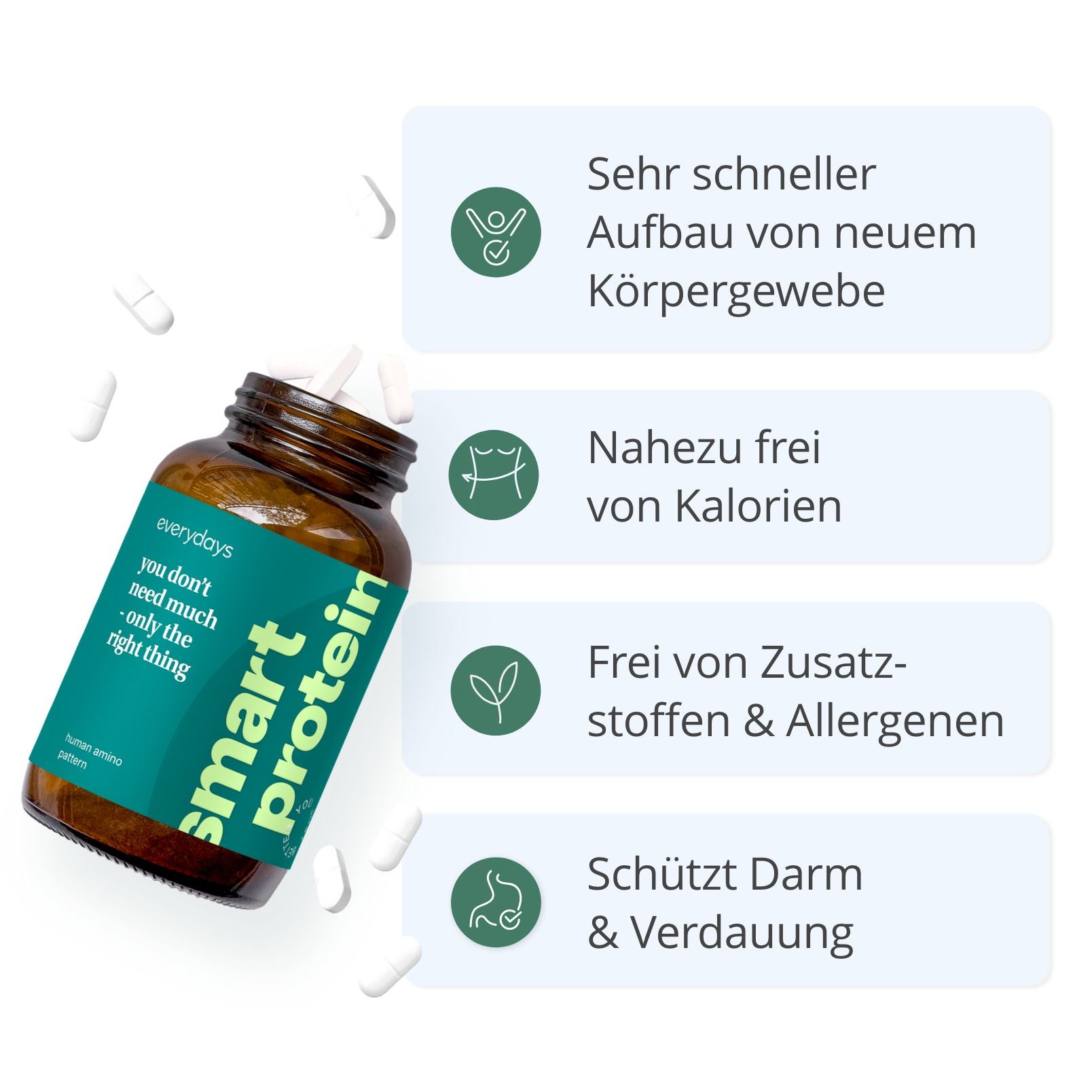 Die Aminosäuren in smart protein sind so kombiniert, dass sie optimal vom Körper verwertet werden können. Im Vergleich zu herkömmlichen Proteinquellen wie Shakes oder Lebensmitteln wird smart protein schneller aufgenommen und nahezu vollständig in körpereigenes Gewebe umgewandelt.