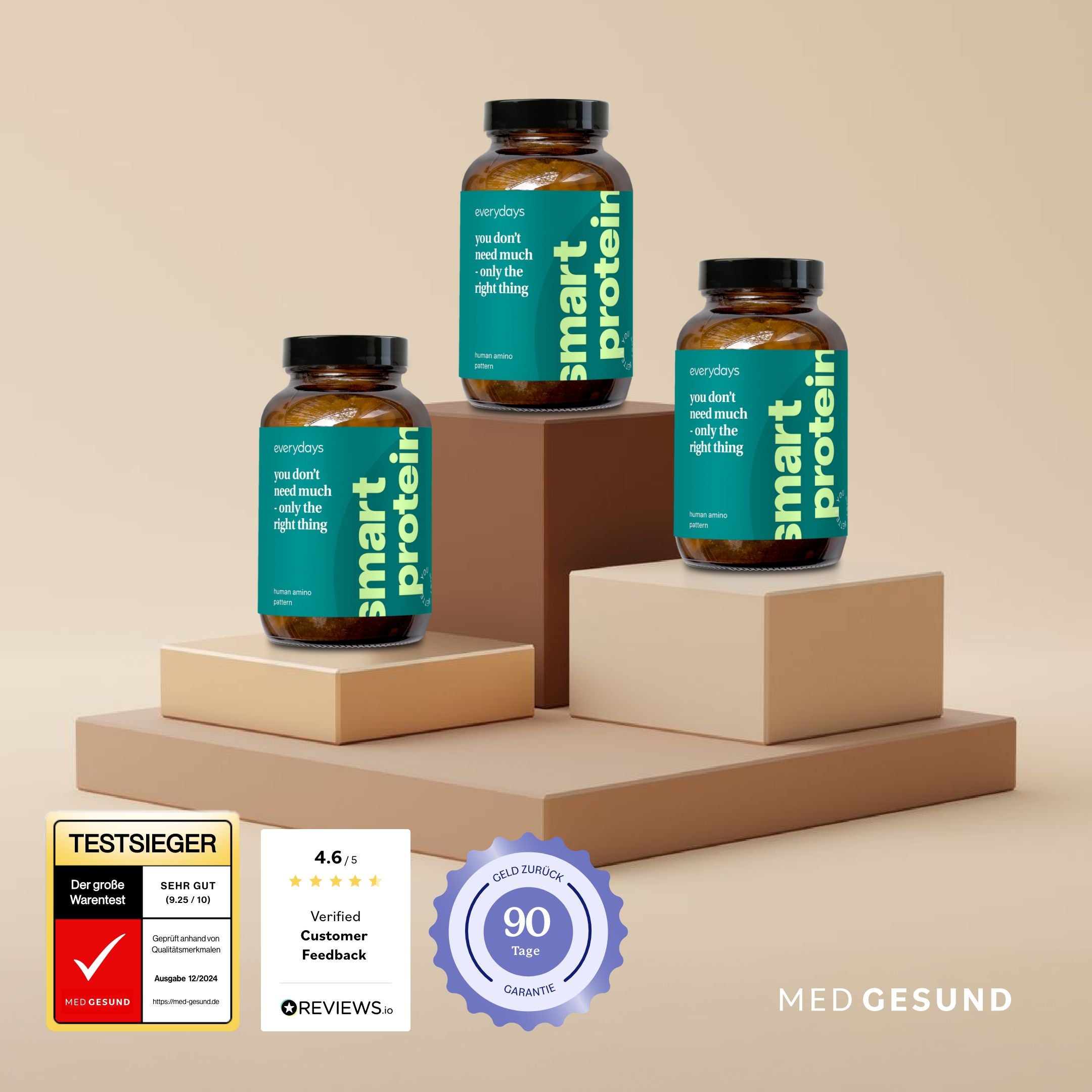 Angebotsinhalt: 3 Monats-Vorrat (3 Packungen), Premium Pillendose, E-Book über Proteinirrtümer - 90 Tage Zufriedenheitsgarantie / Rückgaberecht (nur online, Apothekenrückgabe ausgeschlossen)