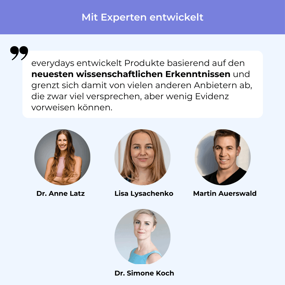 „Everydays entwickelt Produkte basierend auf den neuesten wissenschaftlichen Erkenntnissen und grenzt sich damit von vielen anderen Anbietern ab, die zwar viel versprechen, aber wenig Evidenz vorweisen können. Es ist das einzige Produkt in Deutschland, das nach dem Human Amino Pattern entwickelt wurde.“