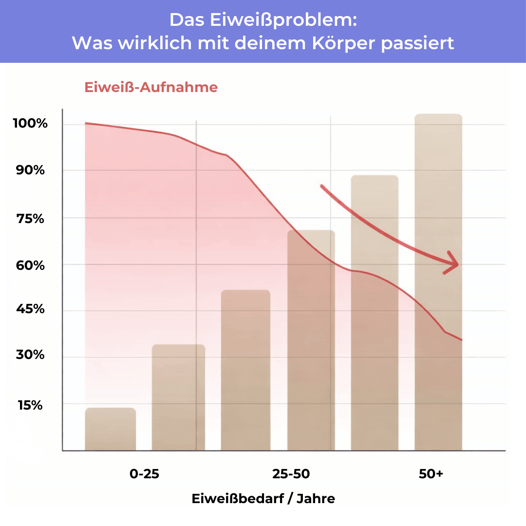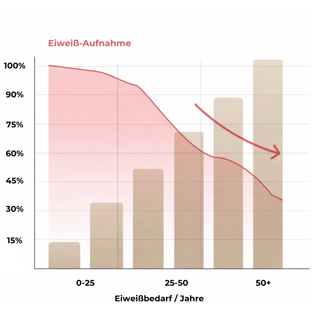Über 90 % aller biologischen Prozesse im menschlichen Körper sind direkt oder indirekt proteinabhängig. Doch bereits ab dem 30. Lebensjahr sinkt Proteinaufnahme stetig.