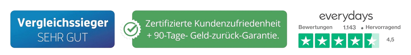 Wir empfehlen nur Produkte, hinter denen wir wirklich stehen! Everydays bietet eine 90-Tage-Geld-zurück-Garantie an. Eine E-Mail an service@everydays.de genügt, und der Betrag wird ohne Wenn und Aber noch am selben Werktag zurückerstattet.