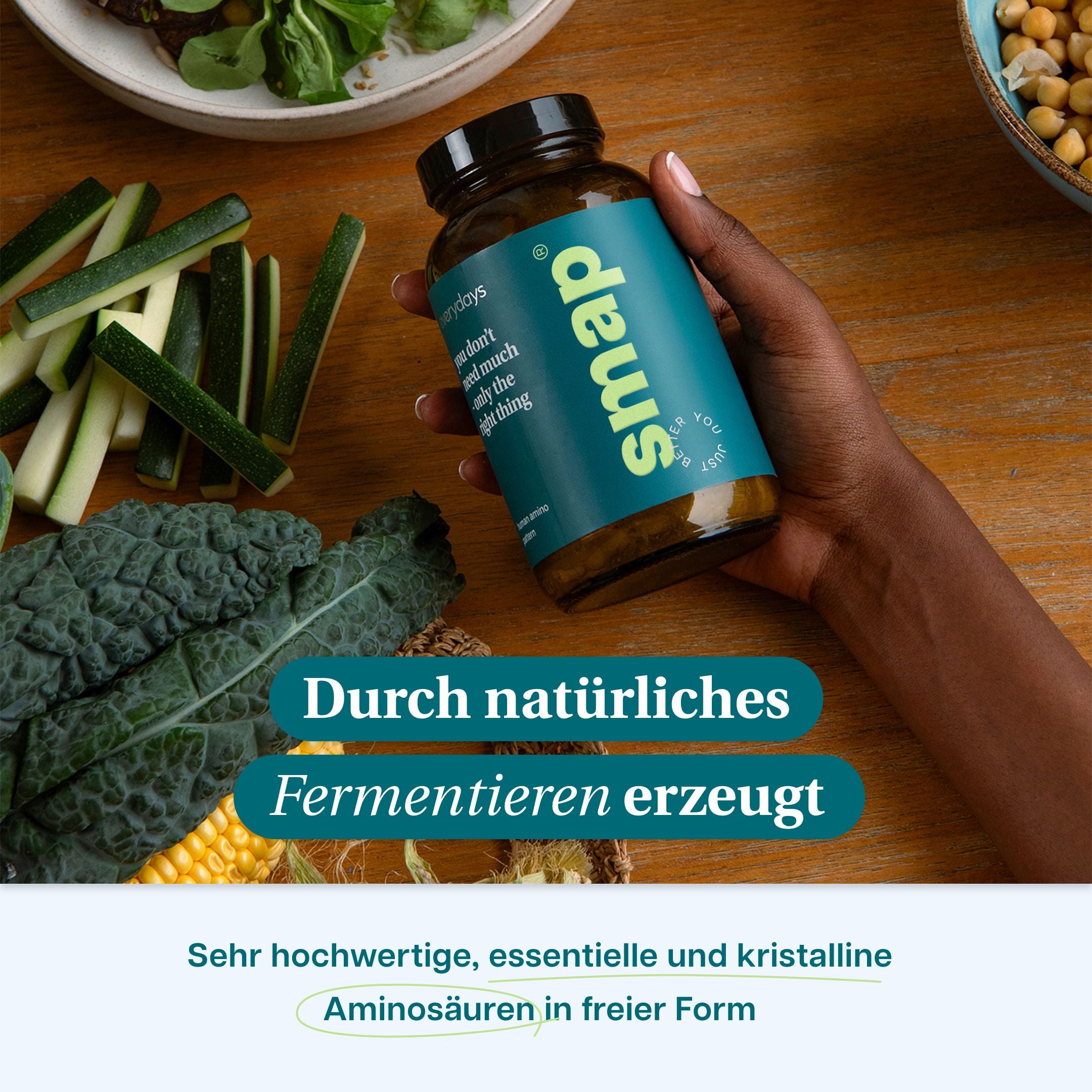 Die Aminosäuren in smart protein werden aus Gemüse herausfermentiert und gereinigt. Der patentierte Fermentationsprozess stellt ein verdauungsähnliches Verfahren dar, was die maximale Bioverfügbarkeit sicherstellt.