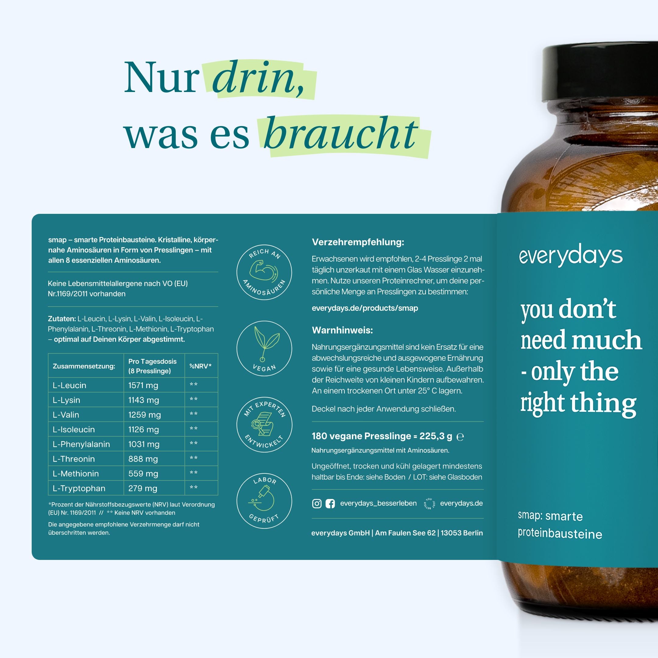 „Everydays entwickelt Produkte basierend auf den neuesten wissenschaftlichen Erkenntnissen und grenzt sich damit von vielen anderen Anbietern ab, die zwar viel versprechen, aber wenig Evidenz vorweisen können. Es ist das einzige Produkt in Deutschland, das nach dem Human Amino Pattern entwickelt wurde.“